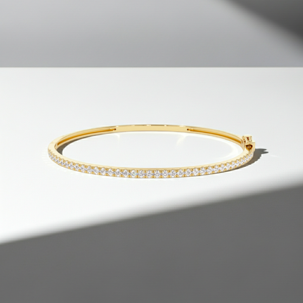 The One Row Diamond Bangle is finished with a polished 14K Solid Gold. This diamond bangle is the perfect addition to any jewelry collection.
