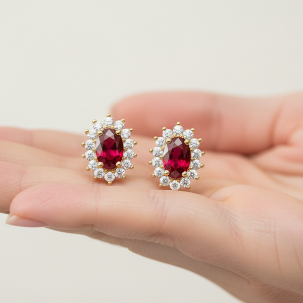 14K solid gold ruby halo style diamond earrings are the perfect way to add a touch of glamour to any look. These earrings feature a stunning Oval ruby in the center surrounded by a halo of dazzling round cut diamonds. The ruby is surrounded by an intricately detailed frame of 14K gold for a luxurious and timeless look. These earrings are the perfect accessory for any special occasion.