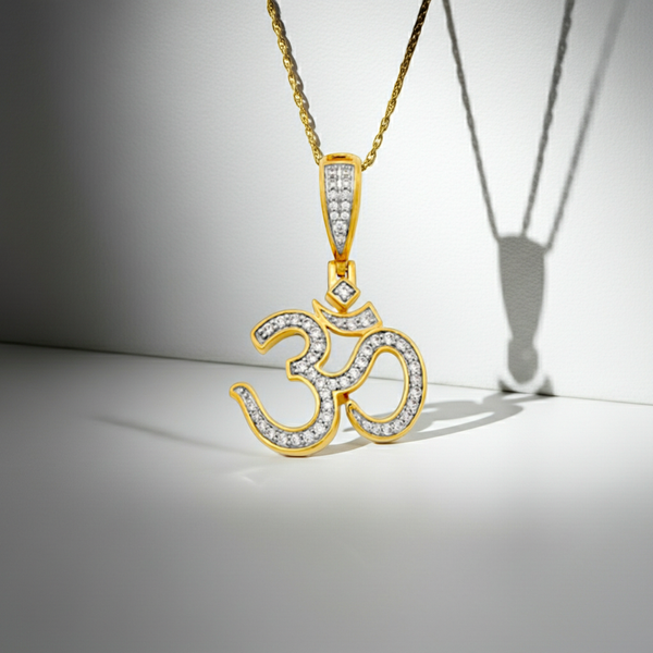 The Om symbol, a universal representation of the divine, is beautifully rendered in a minimalist channel setting, making it a timeless piece that complements any style. Made from 14K solid gold, this pendant exudes both beauty and durability with sparkling Diamonds. Its warm, golden glow adds a touch of sophistication to any outfit.