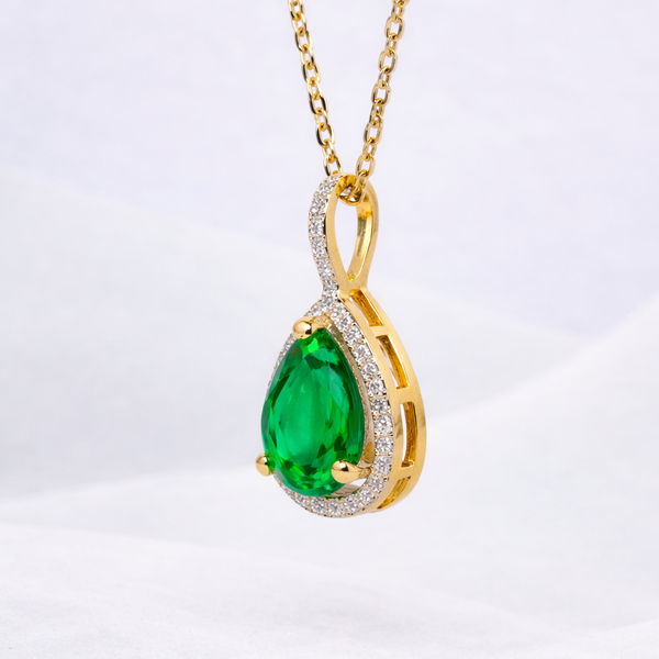 This elegant pendant features a vibrant green pear-shaped emerald, beautifully framed by a halo of sparkling diamonds and set in genuine 14K solid gold. The classic teardrop design offers timeless appeal, making it perfect for everyday wear or special occasions.