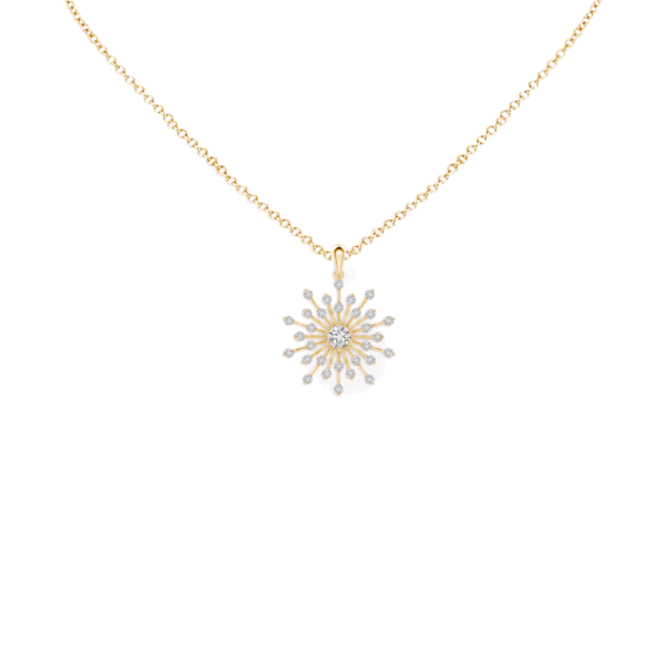 This breathtaking 14K solid gold diamond pendant is a stunning piece of jewelry. It features a motif flower design that is encrusted with shimmering diamonds for a dazzling effect. The pendant has a unique and eye-catching design that is sure to turn heads. It is a perfect accessory to add a touch of luxury and elegance to any outfit.