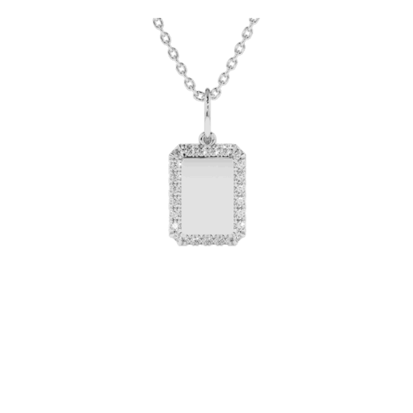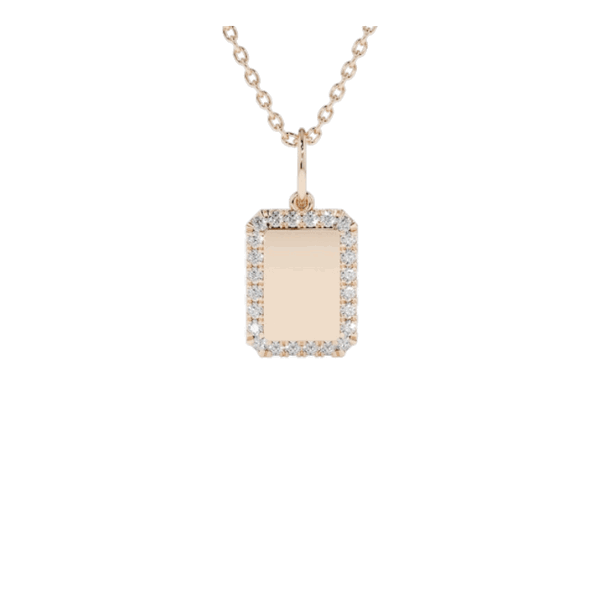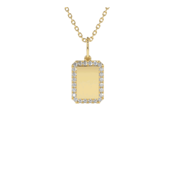 This stunning 14K solid gold diamond pendant features a unique square plate design adorned with dazzling round diamonds. The diamonds are prong set to give it an elegant look that will shine and sparkle in any light.