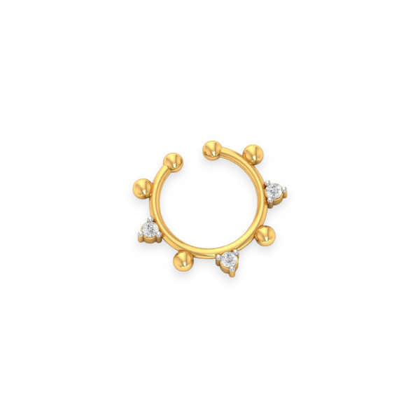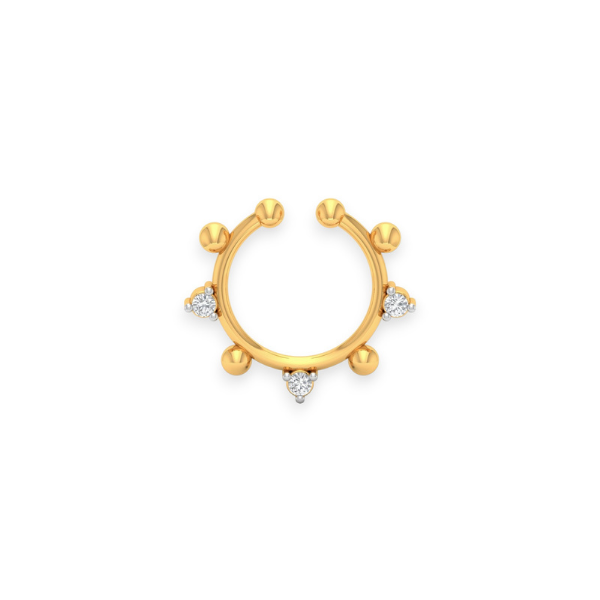 This 18K solid gold unique diamond septum clicker is a modern and eye-catching piece of body jewelry. This clicker features a three round brilliant cut diamonds set securely in a prong, giving it a luxurious and elegant look. The septum clicker is perfect for giving your look an edgy touch and a unique style. It is also a great option for anyone looking for a more subtle way to express their style. The septum clicker comes in a 18K solid gold and is perfect for making a statement with your body jewelry.