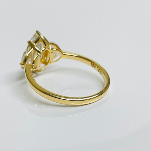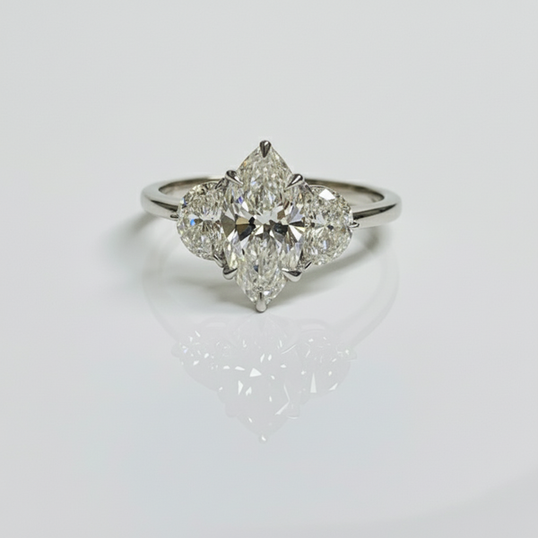 Elevate your engagement with this sophisticated marquise cut diamond ring, expertly crafted in 14K solid gold. The striking center stone is beautifully flanked by crescent moon-shaped side diamonds, creating a celestial-inspired design that captures light from every angle. This three-stone configuration symbolizes your past, present, and future while the marquise's elongated silhouette flatters the hand with an elegant, refined appearance. Ideal for those seeking a distinctive alternative to traditional round cuts, this piece combines timeless craftsmanship with contemporary artistry.