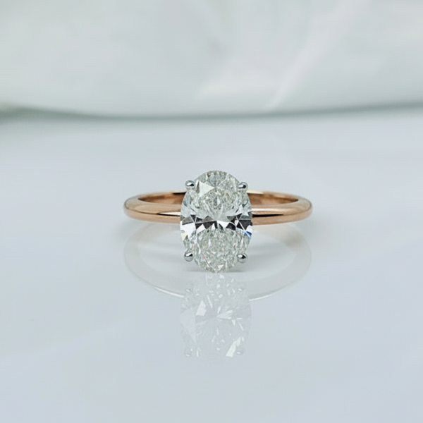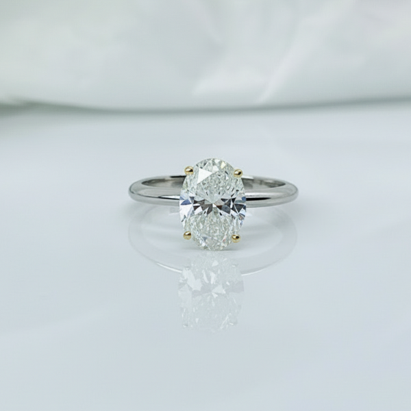 This two-tone oval cut solitaire diamond engagement ring combines the warmth of 14K solid gold with a graceful oval diamond centerpiece. The elegant design highlights the diamond’s unique shape and brilliance, creating a timeless symbol of your love. Its dual-tone finish adds subtle contrast, making it a versatile and beautiful choice for your special moment.